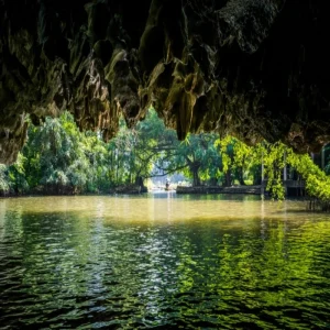 ツアーのクライマックスは、チャンアンの川下りです。小舟に乗って、水墨画のような世界を遊覧します。奇岩がそびえる風景や洞窟くぐりをお楽しみください。全長300メートルもの洞窟の中を小舟で通過していく体験は、他では得られないものです。いつまでも心に残る一日となることでしょう。